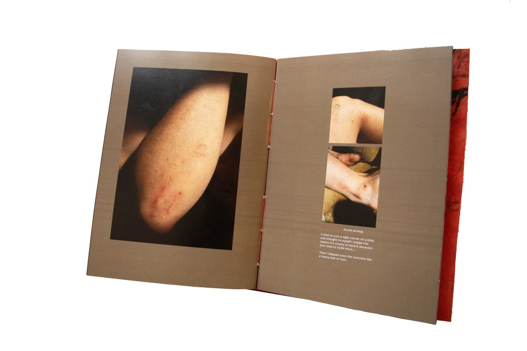 This book chronicles the bumps and tumbles of the summer and all the cuts and bruises they left behind. Each one was carefully photographed, with the knowledge in mind that by the time the book was printed, each injury would have healed without a trace, the skin and bones smooth once more as the body worked its magic.