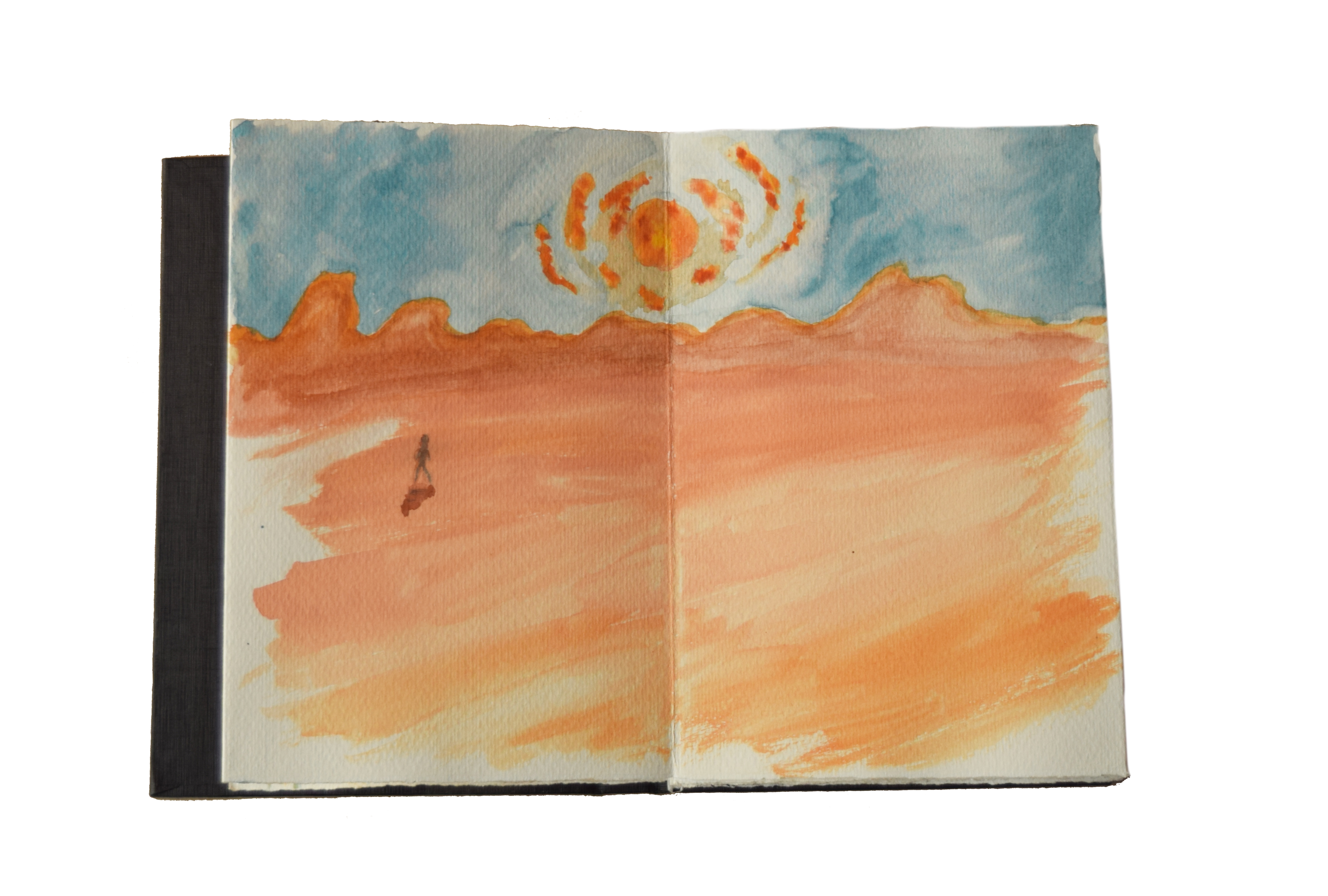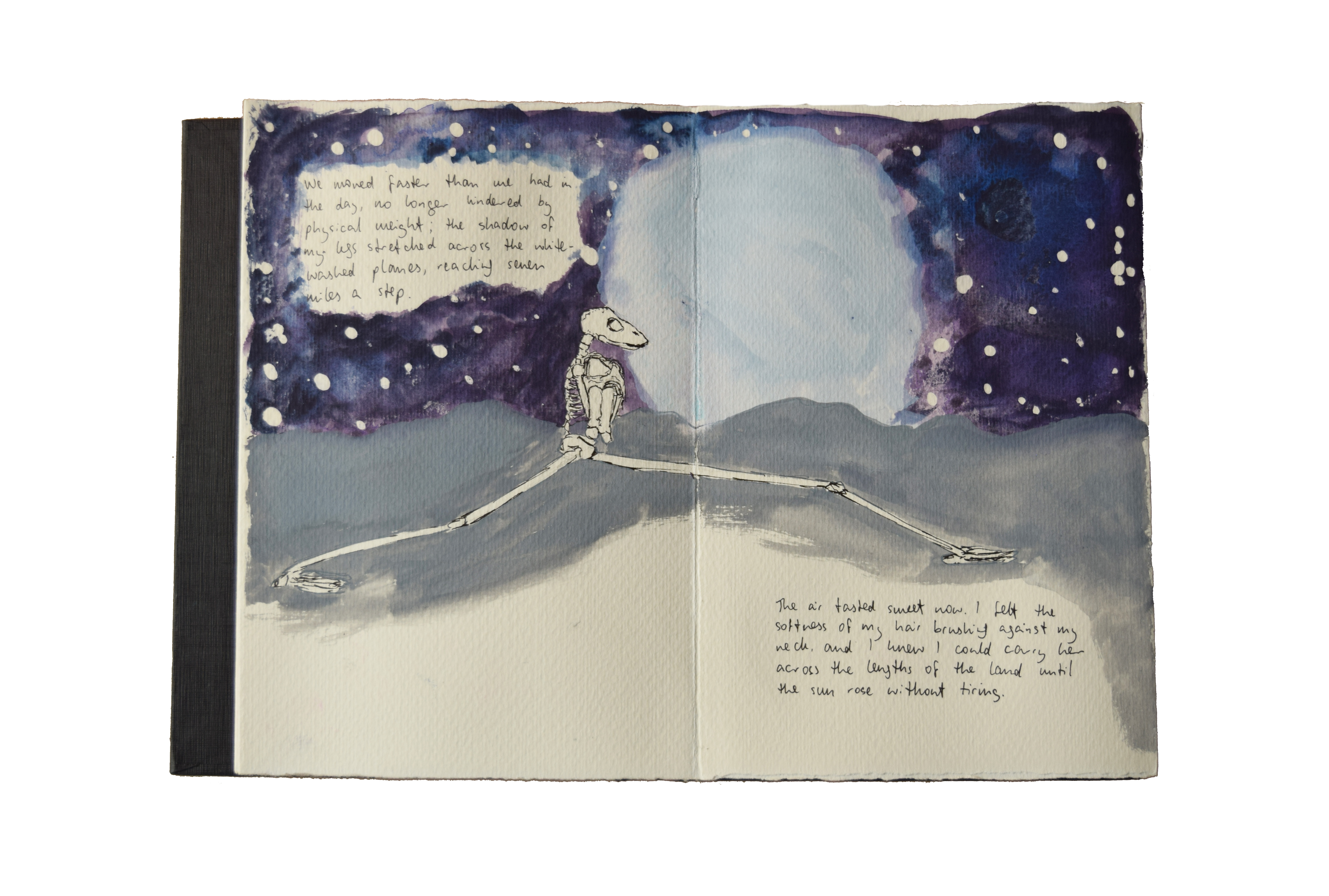 Im Rahmen der «Haus Hund Hengst» Ausstellung (2024) habe ich eine Kurzgeschichte aus meiner Jugend neu belebt und als illustriertes Buch gestaltet. Der Text trägt den Titel «Nightwalker», und handelt sich um eine Protagonistin, die nach dem Tod ihres Körpers ihre nächtliche Reise durch die Wüste als geistliches Wesen fortsetzt.